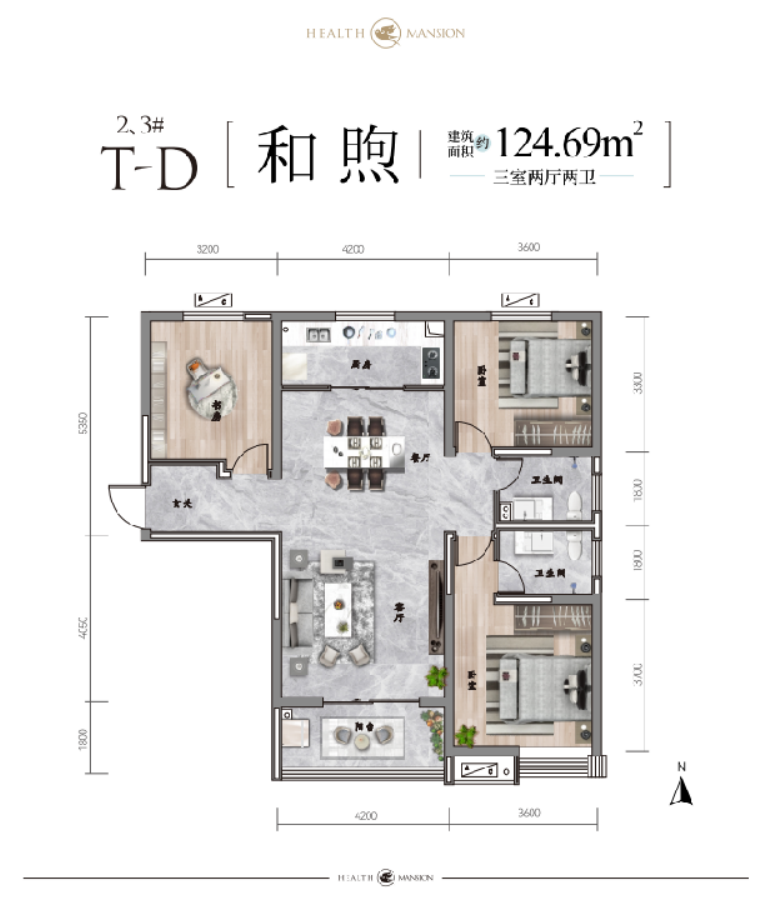 3室2厅2卫-和煦-124.69㎡ | 三室两厅两卫