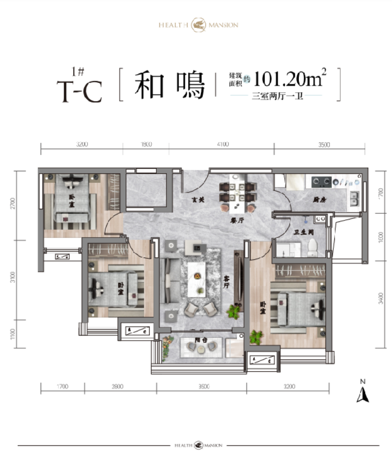 3室2厅1卫-和鸣-101.2㎡ | 三室两厅一卫