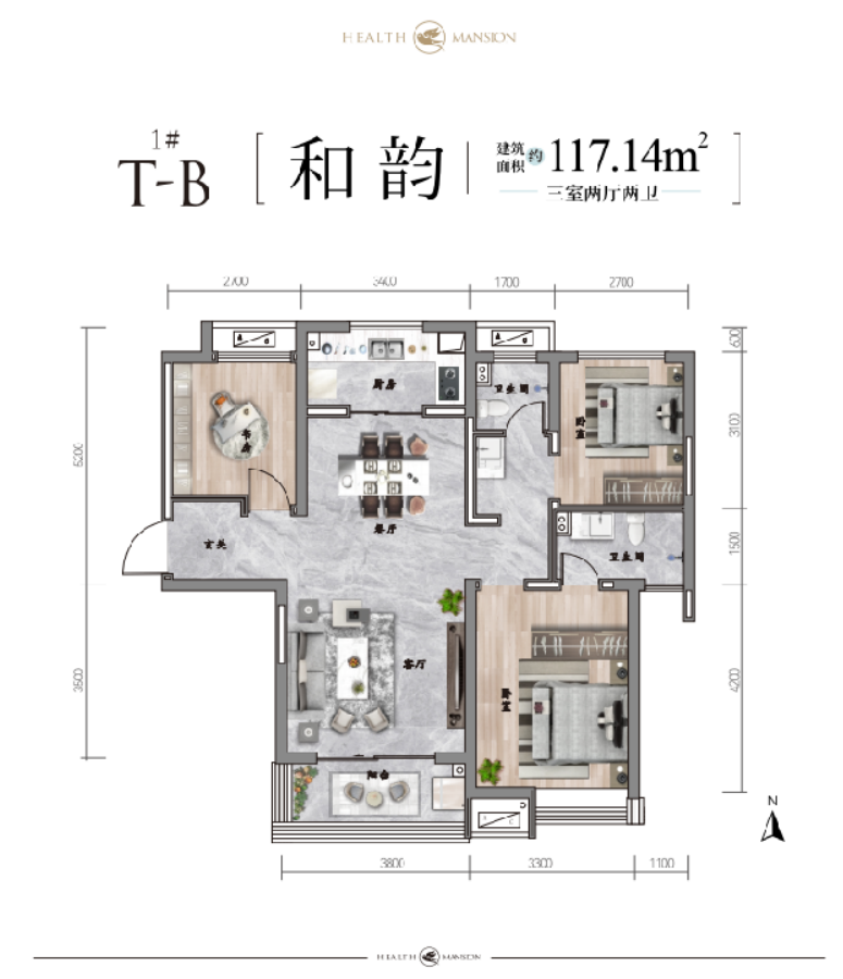 3室2厅2卫-和韵-117.14㎡ | 三室两厅两卫