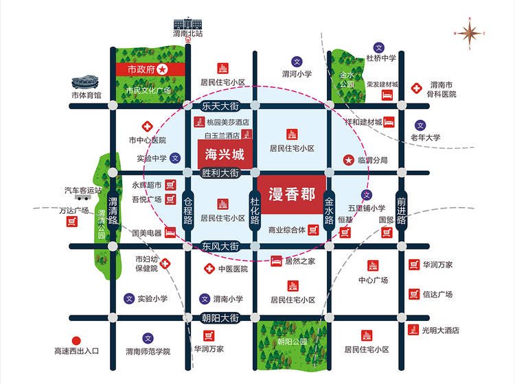 交通配置:渭南北站、新客运中心交通门户,有1、2、6、8、11、12、13、16、216路公交车