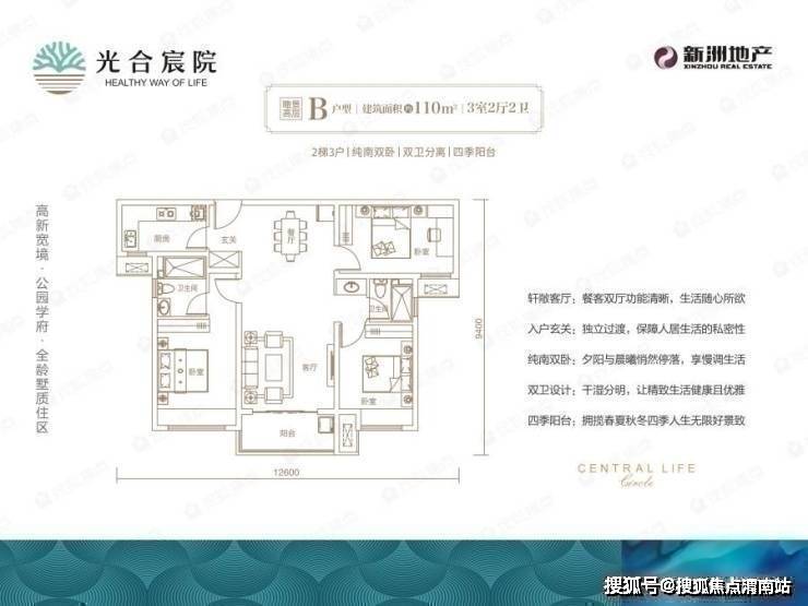 光合宸院约110㎡小3室,首付10万起,南向3开间+双卫设计,再加上南向奢阔观景阳台,户型整体兼顾了小3室的功能性和大户型的舒适度。