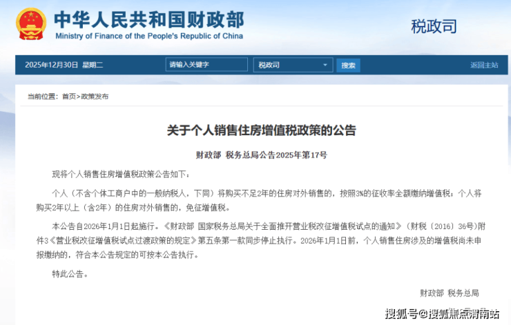 本公告自2026年1月1日起施行。《财政部 国家税务总局关于全面推开营业税改征增值税试点的通知》(财税〔2016〕36号)附件3《营业税改征增值税试点过渡政策的规定》第五条第一款同步停止执行。2026年1月1日前,个人销售住房涉及的增值税尚未申报缴纳的,符合本公告规定的可按本公告执行。
