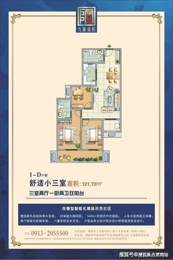 九溪庭院项目占地21亩, 约5400㎡园林,由两栋住宅组成。九溪庭院位于临渭区金水路与胜利大街交汇处西100米,作为渭南核心区的改善型社区,优越的地理位置和丰富的社区配套,项目采用全封闭管理,八重安防。外墙红外线检测、360°电子监控、车库入口电子识别、小区入口电子识别、单元入口对讲电子识别、电梯刷卡,入户门人脸识别、24小时安保新风/净水系统,85米超宽楼间距。