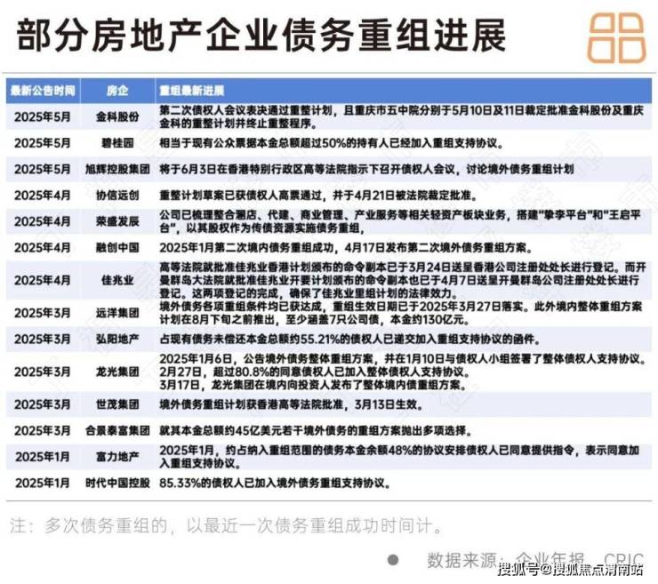 如2025年4月融创公布境外债二次重组方案,涉及近百亿美元债务全部转股;协信远创等39家企业重整计划草案获债权人高票通过,并于4月21日被法院裁定批准,成为全国首个通过司法重整实现纾困的百强房企;
