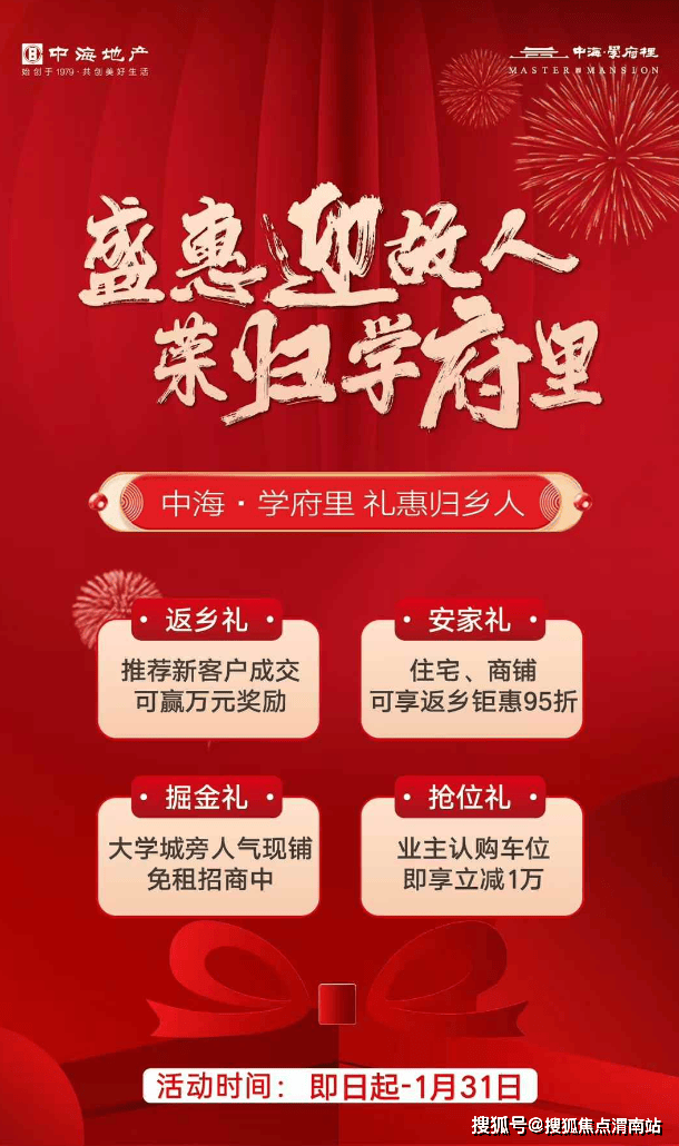 2025年1月,中海学府里返乡置业4重礼来袭,活动时间即日起-1月31日。中海学府里约113-173㎡实景现房、准现房在售。