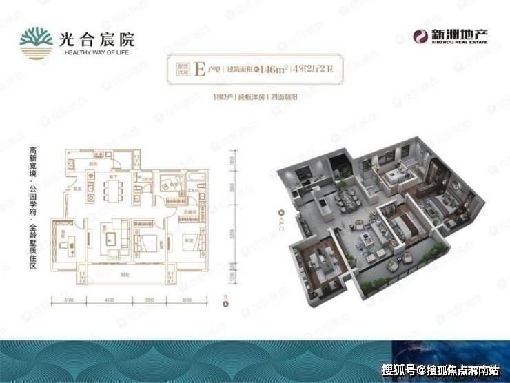 洋房方面,光合宸院9#楼墅质洋房约146㎡户型,4室2厅2卫户型,四开间朝南近14米的超大面宽,2个卧室+1个书房全部朝南。入户口厨房、餐厅、客厅、阳台一线连接,动静分区合理,美好生活更是张弛有度。