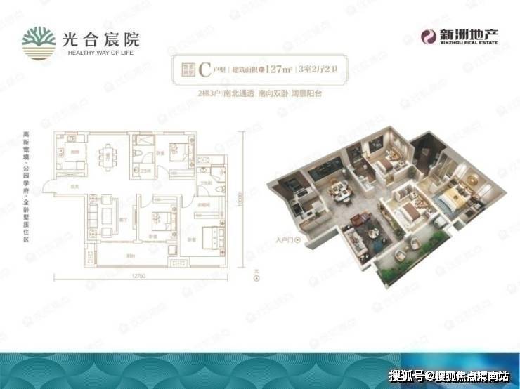 光合宸院约110㎡小3室,首付10万起,南向3开间+双卫设计,再加上南向奢阔观景阳台,户型整体兼顾了小3室的功能性和大户型的舒适度。