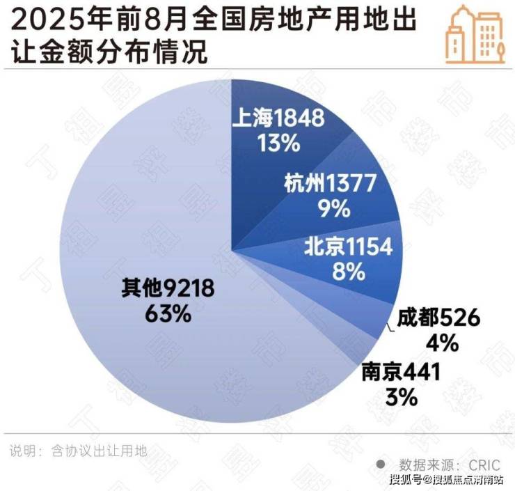 2025年前8月,上海土拍成交金额高居全国 第一,出让总价达到1848亿元,杭州、北京分列2、3位,出让总价分别达到1377亿元和1154亿元。