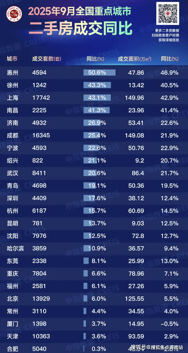 具体来看,9月惠州二手房成交套数4594套,同比涨幅达到50.6%,在中指研究院的统计中涨幅第一。徐州9月二手房成交量1242套,同比涨幅43.3%。