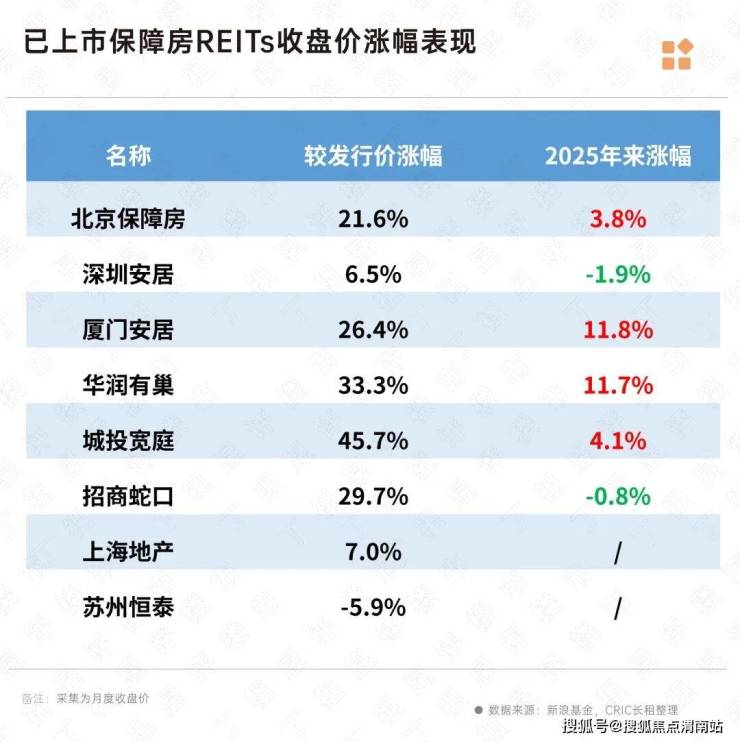 从各REITs收盘价涨幅表现来看,城投宽庭保租房REIT较发行价涨幅达45.7%最高,2025年来厦门安居、华润有巢REIT涨幅表现均超10%。