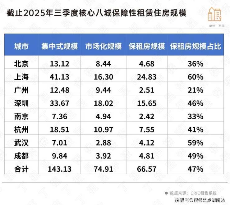 截止2025年三季度,核心八城集中式公寓规模约143.13万套,其中保租房66.57万套,占比约47%,“市场化+保租房”双轨格局成型。