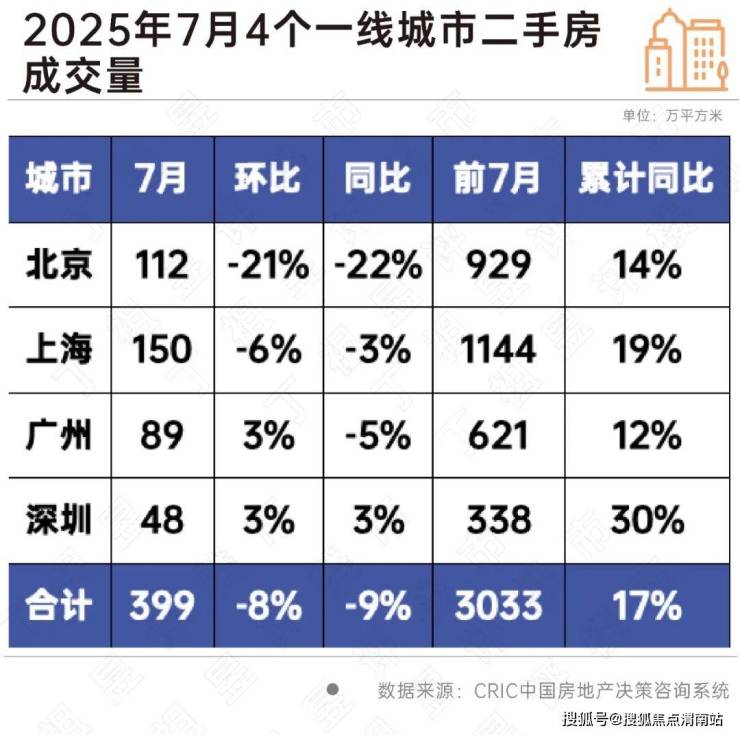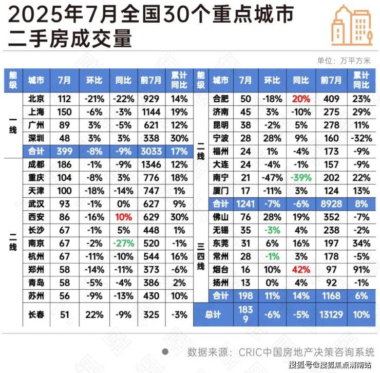 CRIC数据显示,2025年7月30个重点城市二手房成交面积约为1839万平方米,环比下降6%,同比下降5%,前7月累计同比正增10%。不同能级呈现出显著的差异化行情。