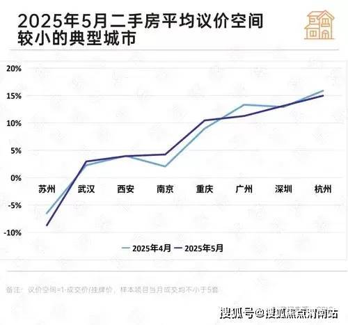 数据显示,5月典型城市二手房平均议价空间为15.4%,环比下降0.1个百分点,再创2024年以来新低,买卖双方价格预期趋同。重点城市中,苏州、武汉、西安等8城议价空间低于15%,苏州、南京、武汉、西安连续7个月低于10%,优质房源成交易主力,改善及高端板块信心回升。