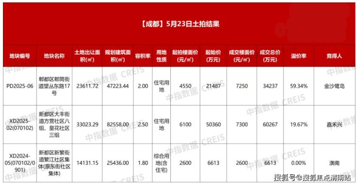 最终,郫都区地块被金沙鹭岛以总价3.42亿元、楼面价7250元/平方米、溢价率59.34%竞得;新都区大丰街道地块经过20余轮举牌争夺,被嘉禾兴地产以总价6.03亿元、楼面价7300元/平方米、溢价率19.67%夺得;新都区新繁街道地块则被澳南以底价获得。