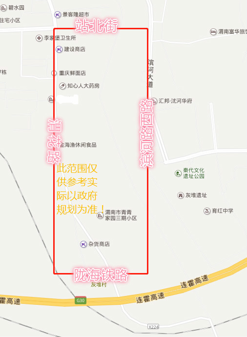 一、征收范围:东至滨河路西路,西至渭花路,南至陇海铁路,北至站北街,涉征范围内的土地及地面建筑物、构筑物、附属物以及各类公共设施,具体四址以规划放线为准。