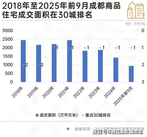 成都作为热点城市,不仅是2025年,一直以来都稳居热点城市前列。从2018年至2025年前9月成都新房成交面积及在30个重点城市中的排名来看,2020年至今成交面积一直排30城中第一。