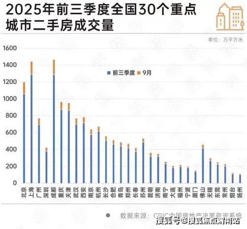 不仅是新房市场,从二手房市场来看,2025年前三季度,成都二手房成交1466万平方米,累计同比上升24%,同样在30城中排名第一,上海排名第二,前三季度成交面积1444万平方米,累计同比上升19%。