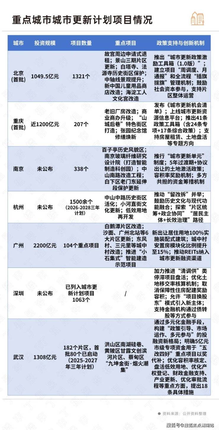 重庆发布2026年首批《城市更新机会清单》,收录207个城市更新项目,总投资近1200亿元。武汉宣布投资1308亿元,力争三年完成182个片区改造,投资力度居前列。广州计划投资2200亿元,推进104个重点项目。