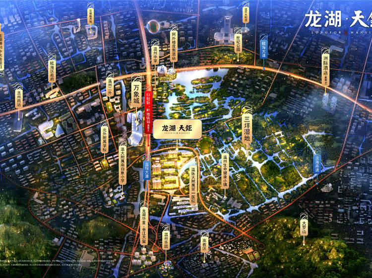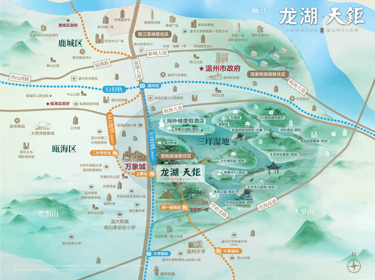 项目居自然、揽繁华,近邻万象城、温医附一医,步行可达轻轨S3/地铁M1线(规划),周边温州中学等百年名校环绕。