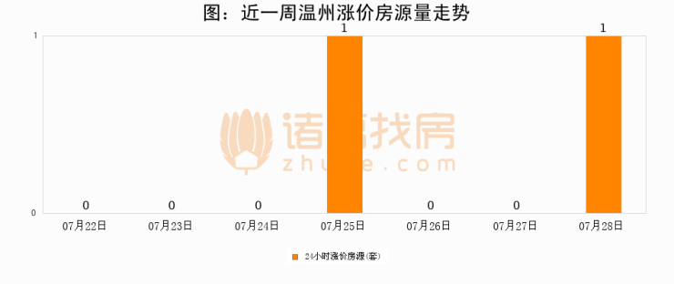 根据诸葛找房数据显示,温州24小时涨价房源量为1套,较07月27日增加1套,环比上涨0%。与此同时,涨价房源占比小幅扩大,业主信心有所提升。