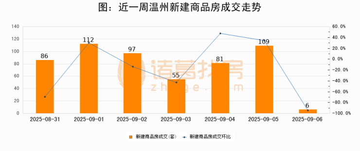 根据温州市住房和城乡建设局数据显示,2025年09月06日温州新建商品房成交6套,较昨日减少103套,环比下降94.5%。近一周温州新建商品房日均成交78套。09月06日单日成交6套,低于近一周平均水平92.3%。