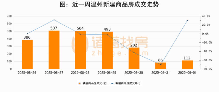 根据温州市住房和城乡建设局数据显示,2025年09月01日温州新建商品房成交112套,较昨日增加26套,环比上涨30.2%。近一周温州新建商品房日均成交339套。09月01日单日成交112套,低于近一周平均水平67%。
