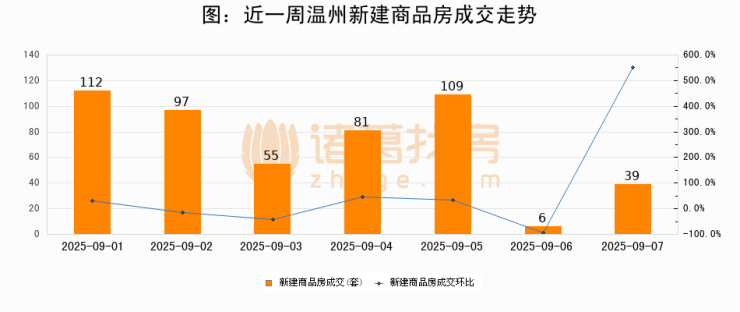 根据温州市住房和城乡建设局数据显示,2025年09月07日温州新建商品房成交39套,较昨日增加33套,环比上涨550%。近一周温州新建商品房日均成交72套。09月07日单日成交39套,低于近一周平均水平45.8%。