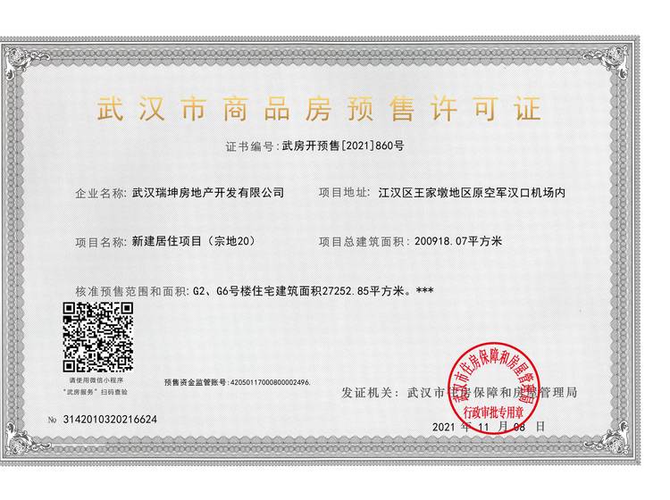 - 武房开预售[2021]860号 详情发证时间 2021-11-08绑定楼栋G2、G6号楼住宅建筑面积27252.85平方米。证件照片