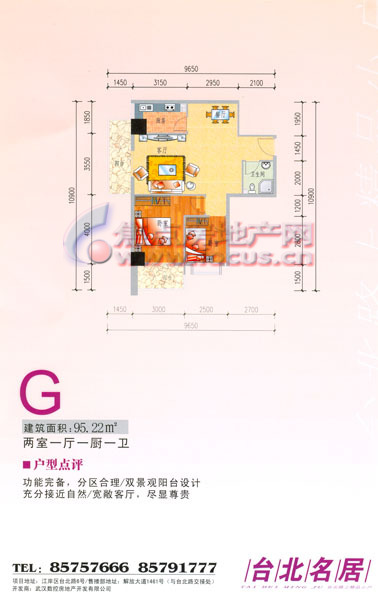 2室1厅1卫-台北名居 G户型两房一厅一卫95.22平方米