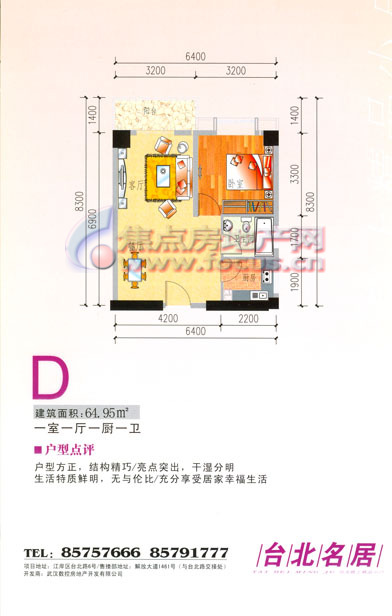 1室1厅1卫-台北名居 D户型一房一厅一卫64.95平方米