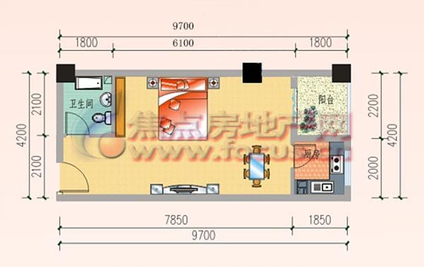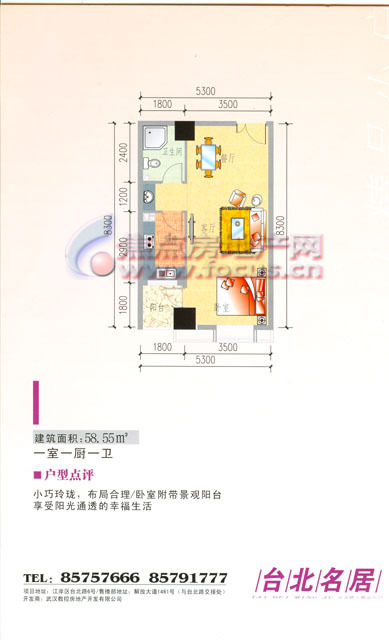 1室1厅1卫-台北名居 I户型一房一厅一卫58.55平方米