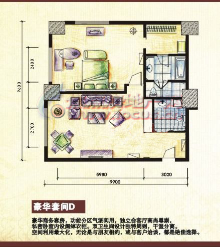 君逸濠天的另一重要组成部分酒店式公寓,全部为小户型精装修,最适合追求品质与自由的SOHO一族,居住在此,可以同时享受都市繁华和自然静谧。