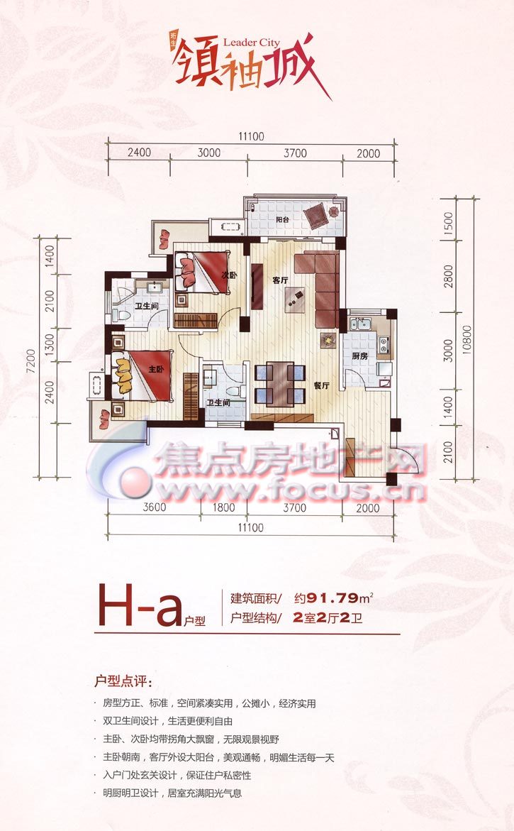 2室2厅2卫-珩生领袖城H-a两室两厅两卫约91.79平米