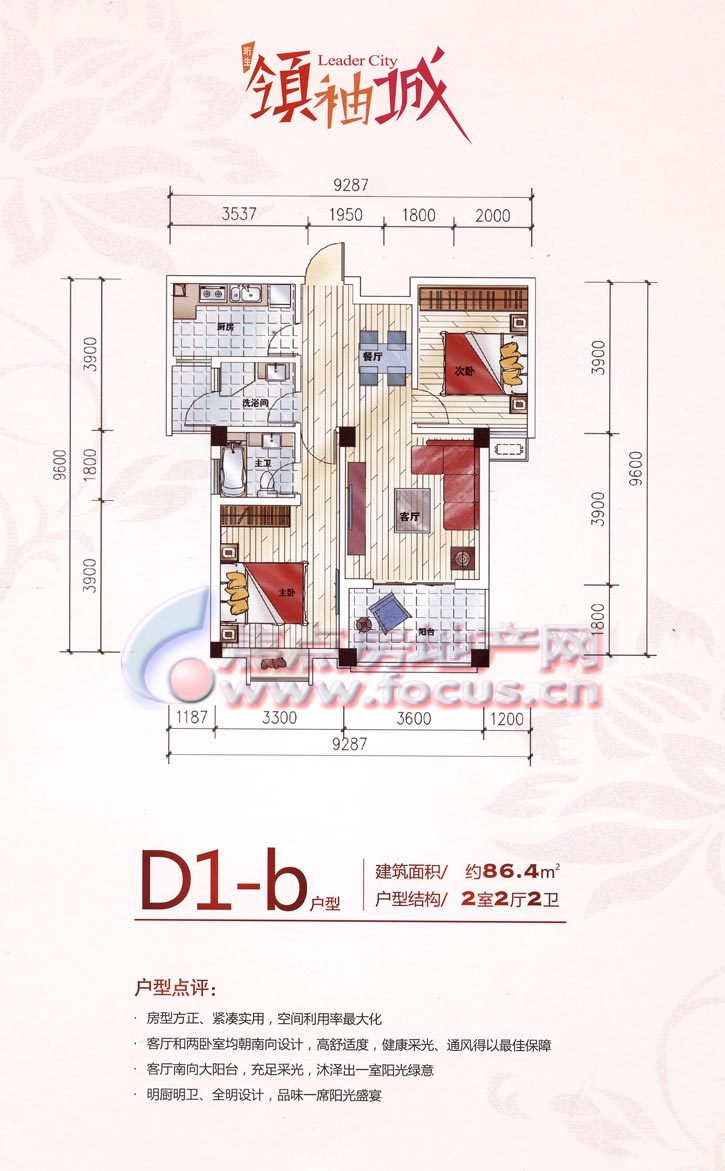 2室2厅2卫-珩生领袖城D1-b两室两厅两卫约86.4平米