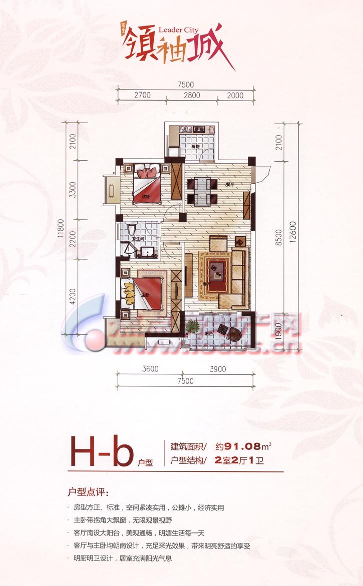 2室2厅1卫-珩生领袖城H-b两室两厅一卫约91.08平米