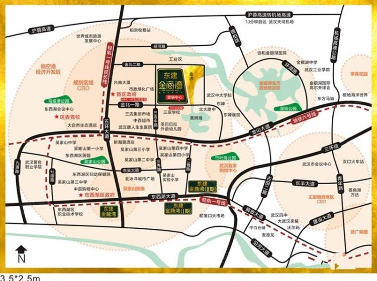 东建金海湾雄踞东西湖区吴家山啤砖路,覆盖周边200万生活社区,近6万消费人潮,环伺新区政府,南临三店中学,西傍新区政府,东瞰私家湖滨水岸,坐拥金银湖生态资源,构造生活、经济、商务、文化、旅游五大中心,缔造醇熟的生活版图,代言东西湖中央生活区,成就中心价值,凸显升值潜力。