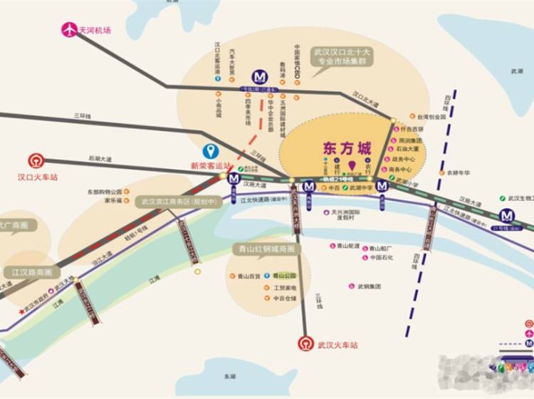 东方城位于汉施大道与汉口北大道交汇处,地处交通要塞,东至阳逻深水港,西接汉口,南通青山,北邻汉口北专业汉口群。