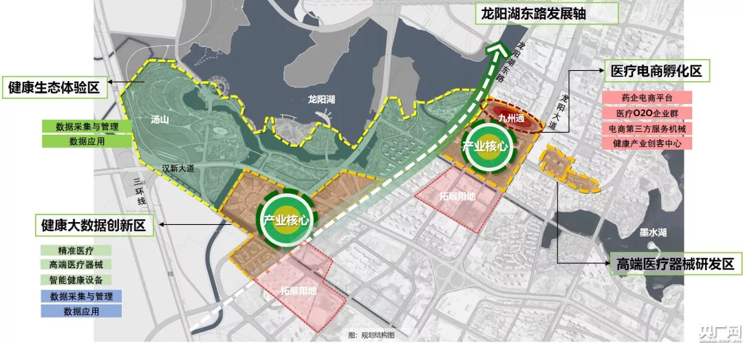 在武汉构建的高级万亿大健康产业集群中,于医药物流、中医药、会展等领域具备传统优势的汉阳区发布《汉阳区大健康产业发展规划(2019-2035)》,按照《规划》,汉阳大健康产业发展区将按照生态、生活、生产“三位一体”的发展思路,形成以“龙阳湖健康谷”为中心,以四新生态新城“智慧医养服务区”和黄金口都市工业园“健康智能制造区”为双翼发展的“一谷两区”空间格局。