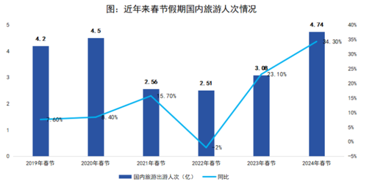 据文化和旅游部数据中心测算,2024春节假期8天全国国内旅游出游4.74亿人次,同比增长34.3%,且今年春节出游人次创2019年以来新高。
