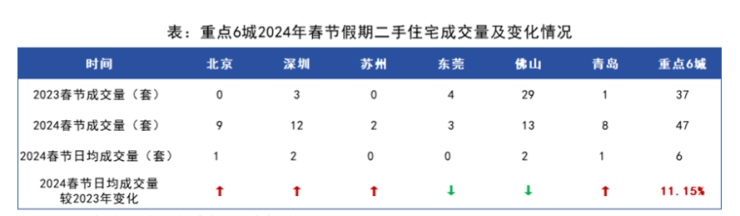 相较于新房,2024春节假期二手房表现较稳,日均成交量赶超去年春节假期。根据诸葛数据研究中心监测数据显示,今年春节假期重点6城二手住宅成交47套,日均成交6套,日均成交量较去年春节假期上涨11.15%。