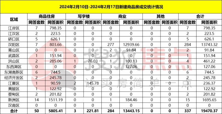 据武汉房管局数据显示,2024年春节期间(2月10日-2月17日),武汉市新建商品房成交备案336套,成交面积19470.37平方米。其中新建商品住宅成交50套,成交面积5805.41平方米;新建写字楼成交3套,成交面积221.81平方米;新建商业成交284套,成交面积13443.15平方米。