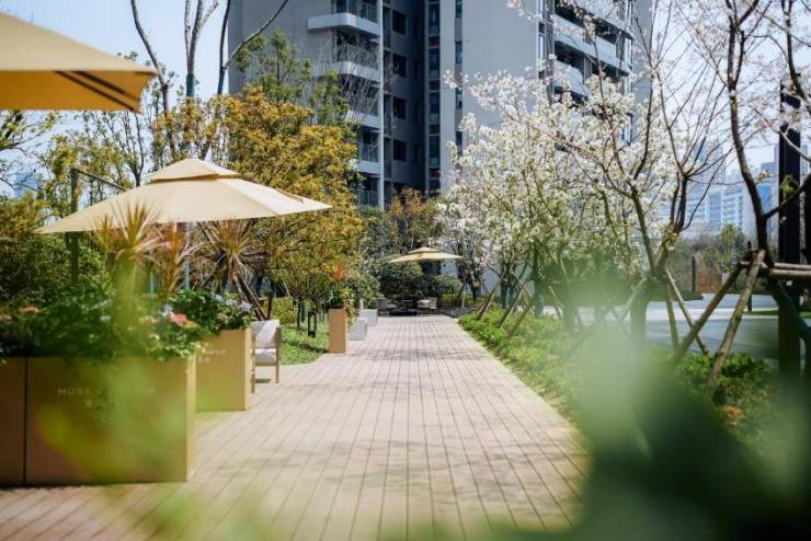独具美感的实景园林精心选取新世界自有苗圃成熟植被全冠移栽,最长树龄达30年以上,整个空间更富景观层次和饱满度。以“竖琴”为设计元素的建筑外立面,塑造出简约艺术的建筑曲线,为所在区域注入更加前沿时尚的建筑美学新范式。