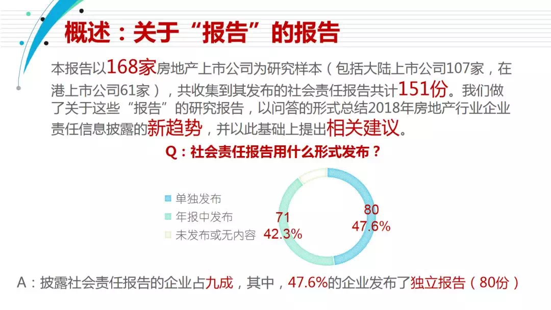 基于对以上168家2018年房地产上市公司社会责任报告的研究,房企正在逐步规范和重视社会责任报告披露,推动信息的公开、透明,成为彰显企业特色和优势的重要平台,起到提升品牌形象的作用。在此要求下,我们建议在披露报告时: