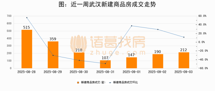 根据武汉市住房保障和房屋管理局数据显示,2025年09月03日武汉新建商品房成交212套,较昨日增加22套,环比上涨11.6%。近一周武汉新建商品房日均成交249套。09月03日单日成交212套,低于近一周平均水平14.9%。