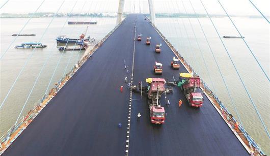 今年6月,历时近3年建设的沌口长江大桥合龙。9月24日,大桥全线沥青施工结束,机电和交通安全等附属工程也在紧锣密鼓跟进施工中。