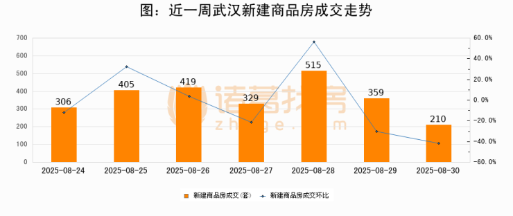 根据武汉市住房保障和房屋管理局数据显示,2025年08月30日武汉新建商品房成交210套,较昨日减少149套,环比下降41.5%。近一周武汉新建商品房日均成交364套。08月30日单日成交210套,低于近一周平均水平42.3%。