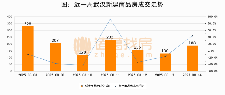 根据武汉市住房保障和房屋管理局数据显示,2025年08月14日武汉新建商品房成交188套,较昨日增加58套,环比上涨44.6%。近一周武汉新建商品房日均成交195套。08月14日单日成交188套,低于近一周平均水平3.6%。