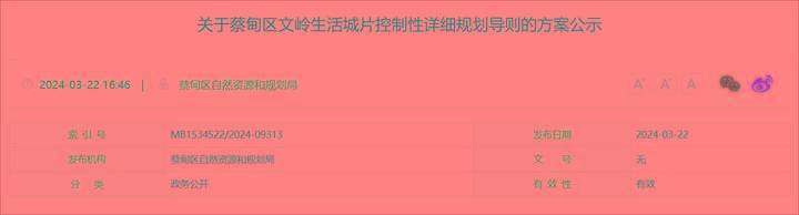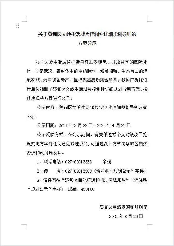 近日,蔡甸区自然资源和规划局发布《关于蔡甸区文岭生活城片控制性详细规划导则的方案公示》。
