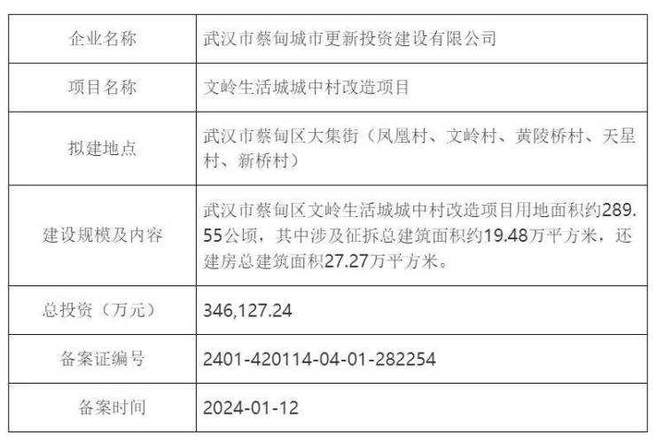 建设内容及规模:武汉市蔡甸区文岭生活城城中村改造项目用地面积约289.55公顷,其中涉及征拆总建筑面积约19.48万平方米,还建房总建筑面积27.27万平方米。