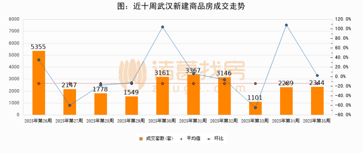 进入2025年第35周(08月25日-08月31日),武汉新建商品房成交2344套,较上周增加55套,环比上涨2.4%。从近十周成交来看,周均成交套数为2623套,本周成交2344套,低于近十周平均成交量10.6%。